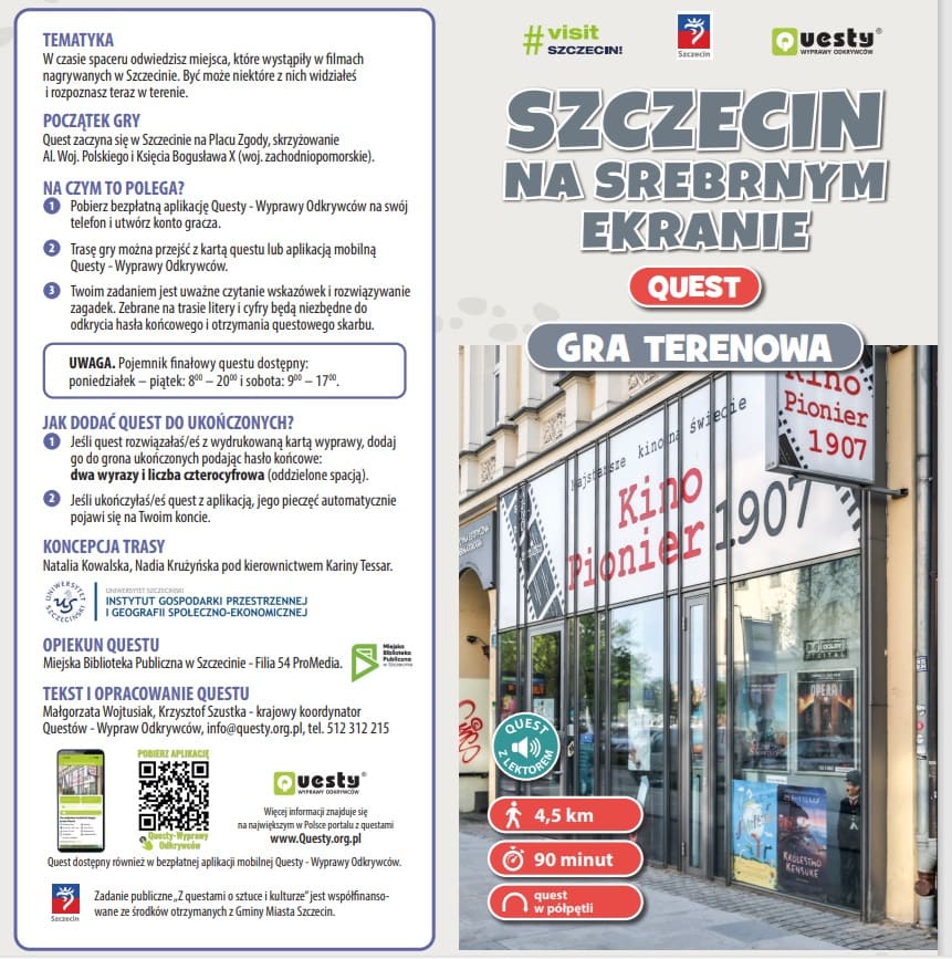 Koncepcja trasy: Natalia Kowalska, Nadia Krużyńska pod kierownictwem Kariny Tessar ⁦https://questy.org.pl/quest/szczecin-na-srebrnym-ekranie⁩