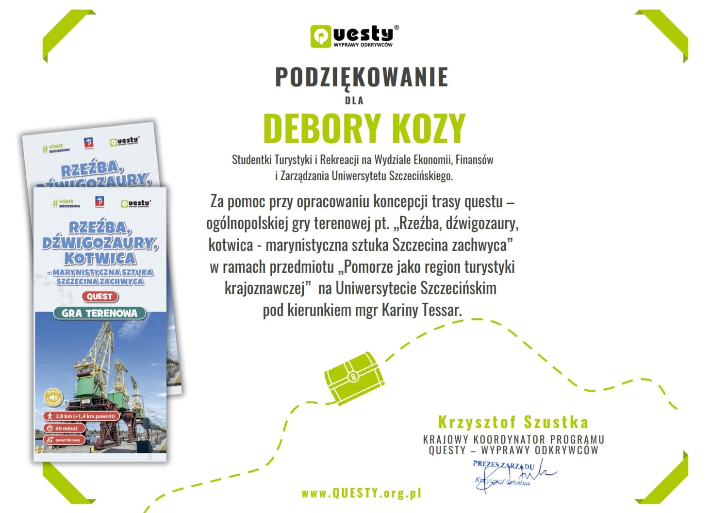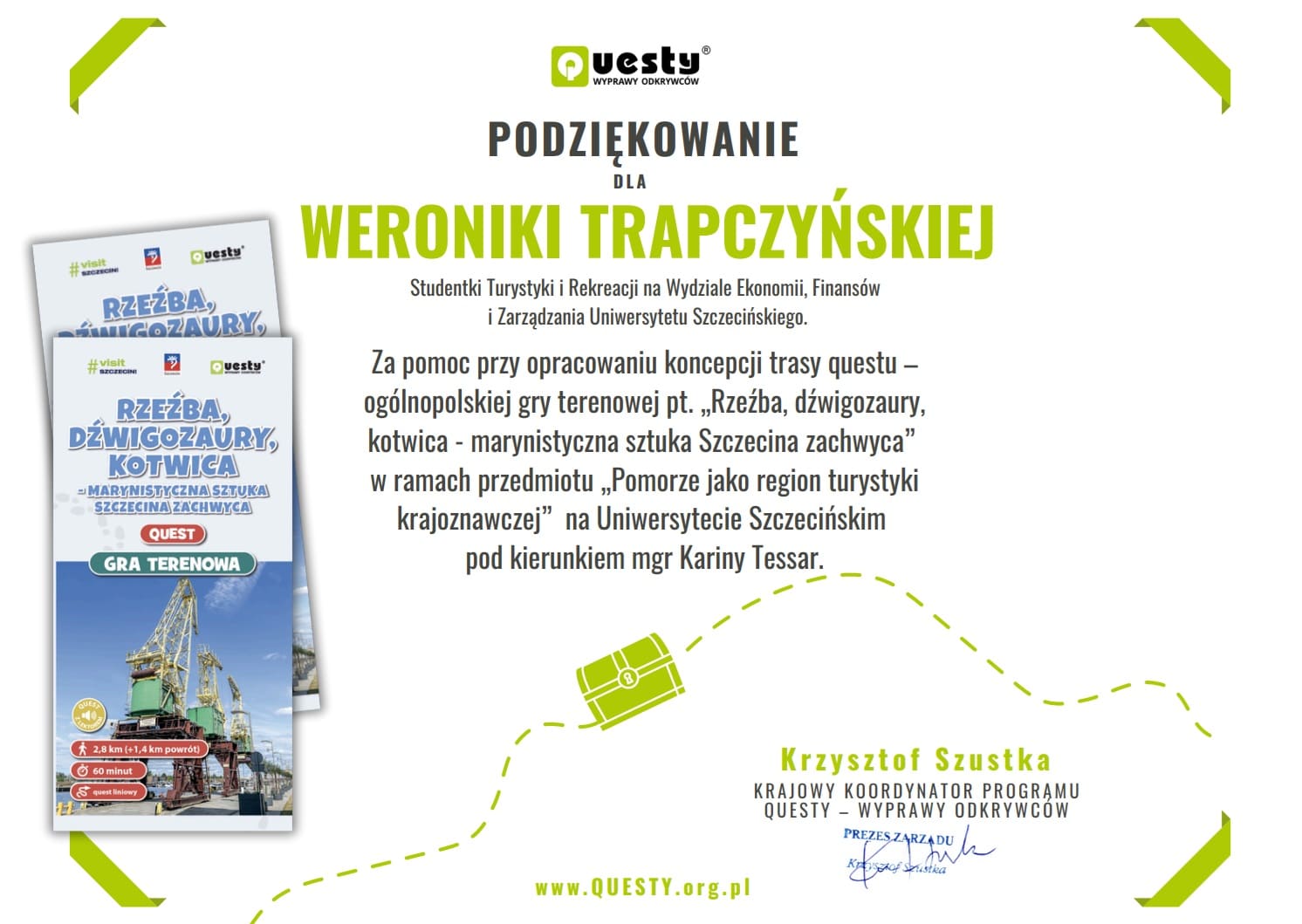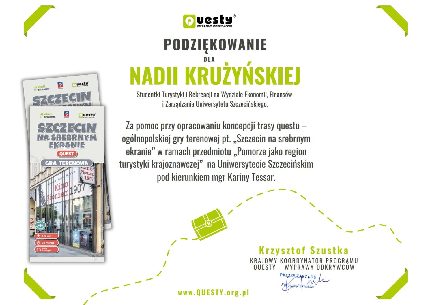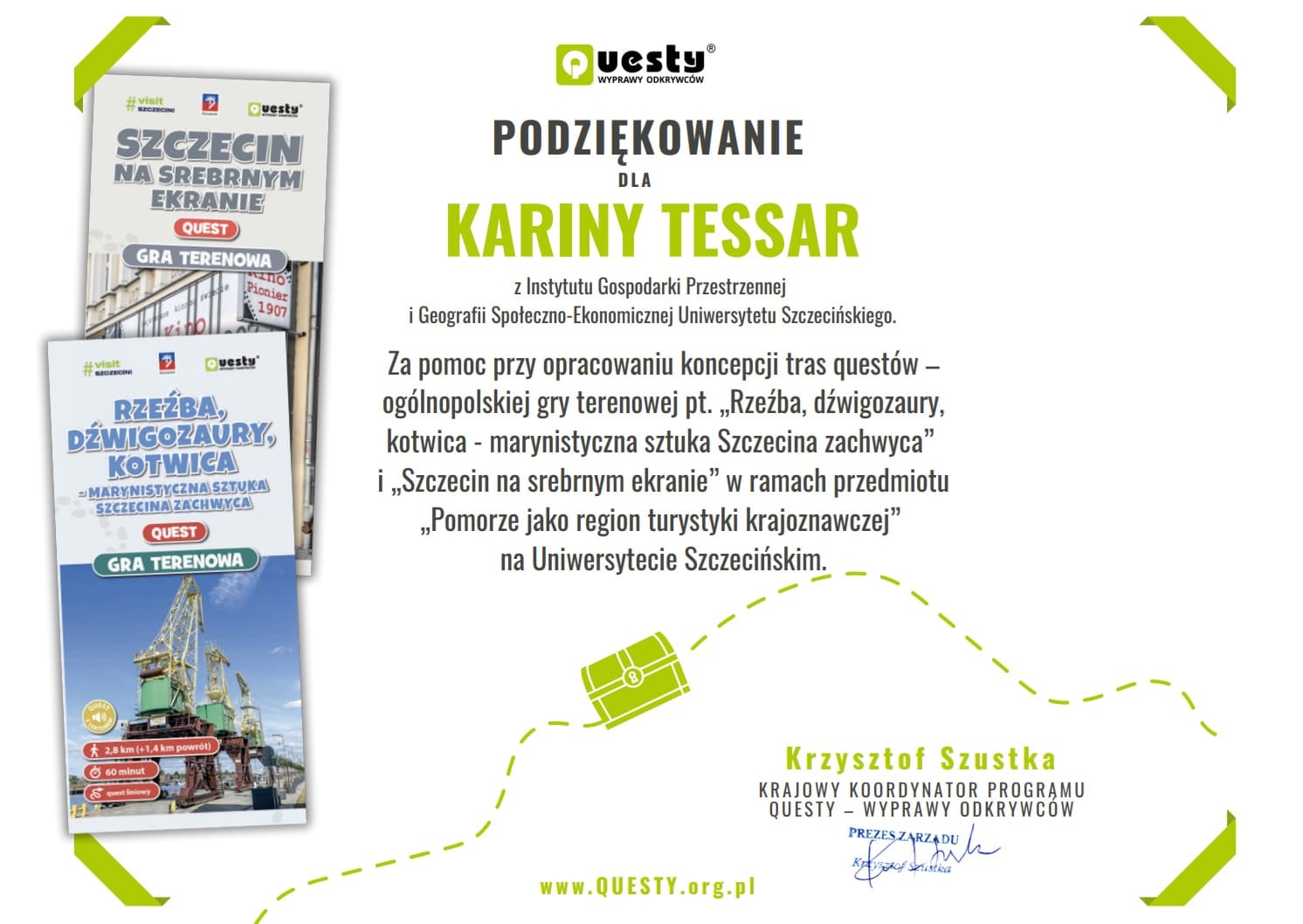 Ich pomysły były konsultowane z Krzysztofem Szustką, krajowym koordynatorem programu Questy – Wyprawy Odkrywców. Dwa z nich zostały wyróżnione i doczekały się realizacji! Autorkami zwycięskich koncepcji są studentki obecnego III roku TiR: Weronika Trapczyńska, Debora Koza, Natalia Kowalska i Nadia Krużyńska. Questy te są dostępne na stronie internetowej www.questy.org.pl oraz w ogólnopolskiej aplikacji mobilnej Questy – Wyprawy Odkrywców – zachęcamy do zwiedzania Szczecina w tak nieoczywisty sposób:
